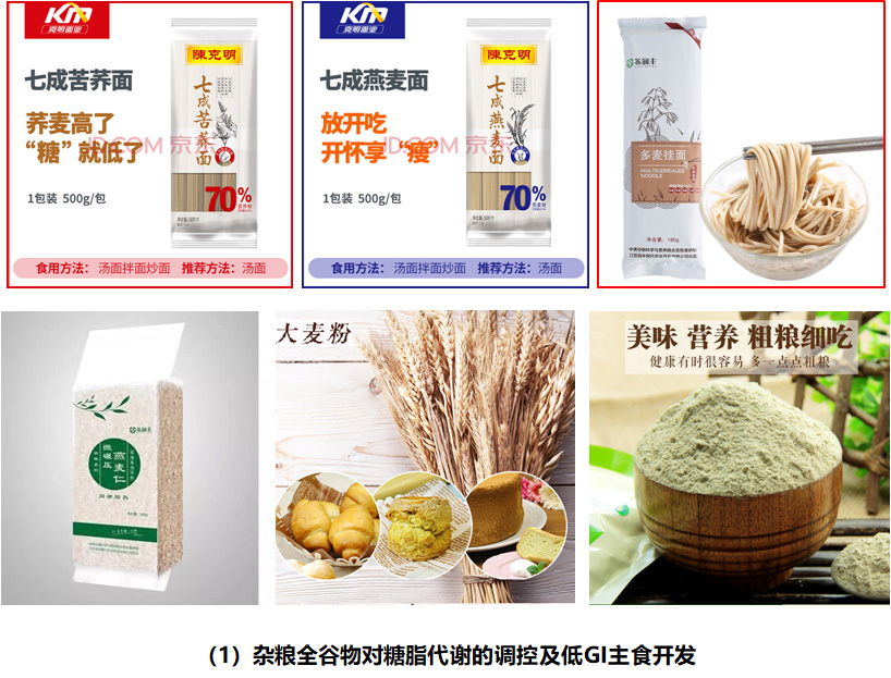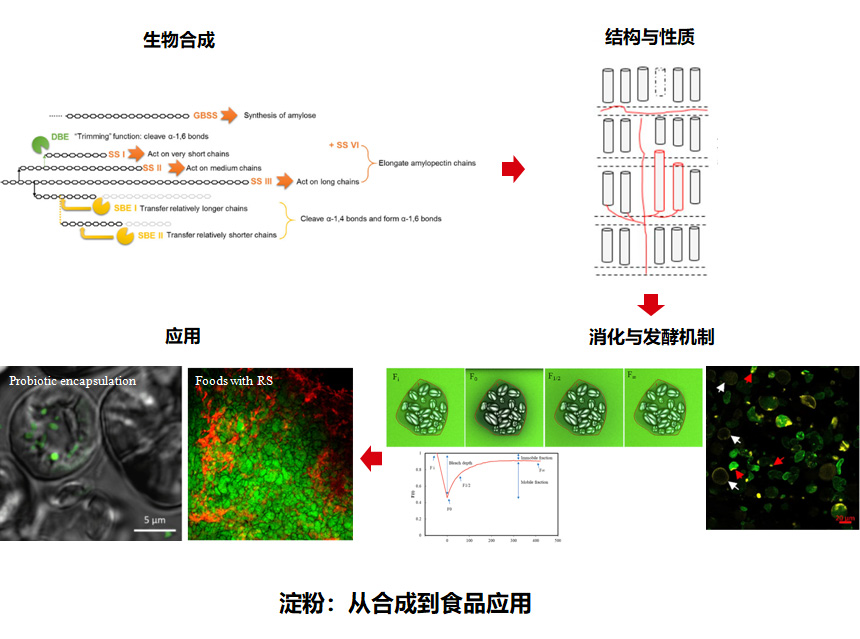 (1)食物与糖脂代谢:基于多组学研究食品中淀粉、蛋白质、油脂、膳食纤维及多酚等生物活性成分的结构-特点-功能-健康的关系;特色谷物资源中调脂降糖功能因子挖掘、对能量代谢及肠道微生态的干预和调节机制;通过组方设计、微囊化、淀粉可控老化等技术,开发淀粉基功能食品,满足不同人群、不同应用场景对形态、能量与功能的需求。