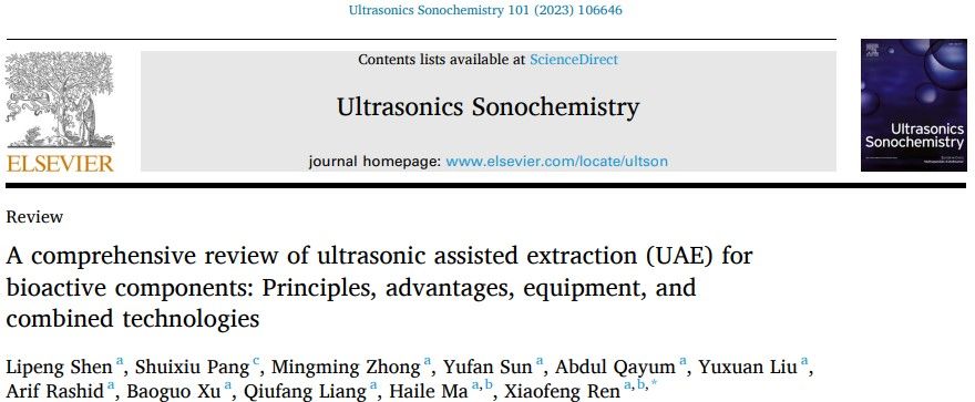 近日,英国365集团任晓锋教授课题组在国际声学顶级期刊《Ultrasonics Sonochemistry》(Q1,IF=8.4)在线发表了标题为 “A comprehensive review of ultrasonic assisted extraction (UAE) for bioactive components: Principles, advantages, equipment, and combined technologies”的综述性论文 (DOI: 10.1016/j.ultsonch.2023.106646)。365英国上市公司硕士生申利鹏为该论文的第一作者,任晓锋教授为通讯作者。