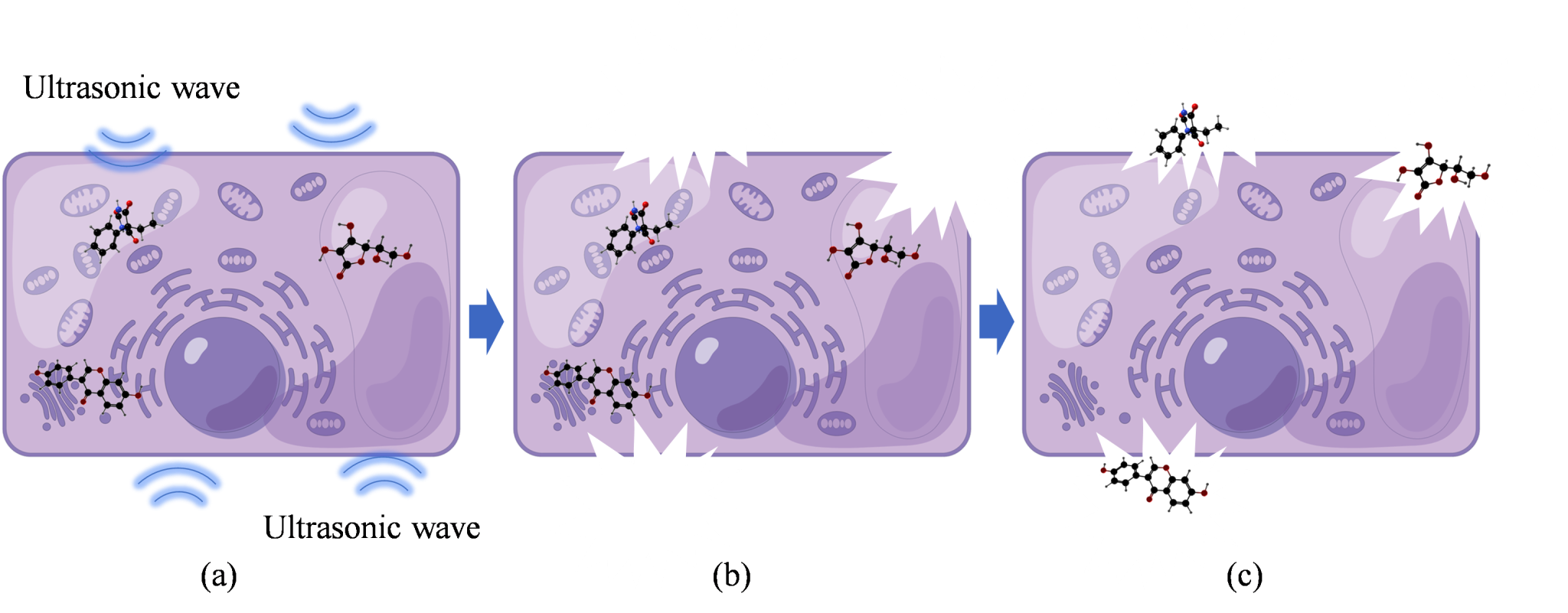 Fig.2 The mechanism of ultrasonic assisted extraction. (a) indicates that ultrasonic will act on intact cell. (b) indicates cell rupture after ultrasonic treatment. (c) indicates that the bioactive components are released