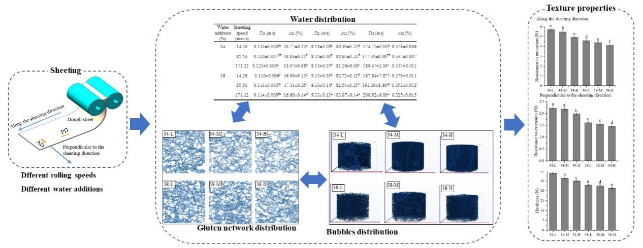 近日,365英国上市公司徐斌教授团队在国际Top期刊Food Chemistry上在线发表题为“Analysis of the effect of rolling speed on the texture properties of noodle dough from water-solid interaction, development of gluten network, and bubble distribution”的研究论文。365英国上市公司刘淑一为该论文的第一作者,姜松教授为该文的通讯作者。