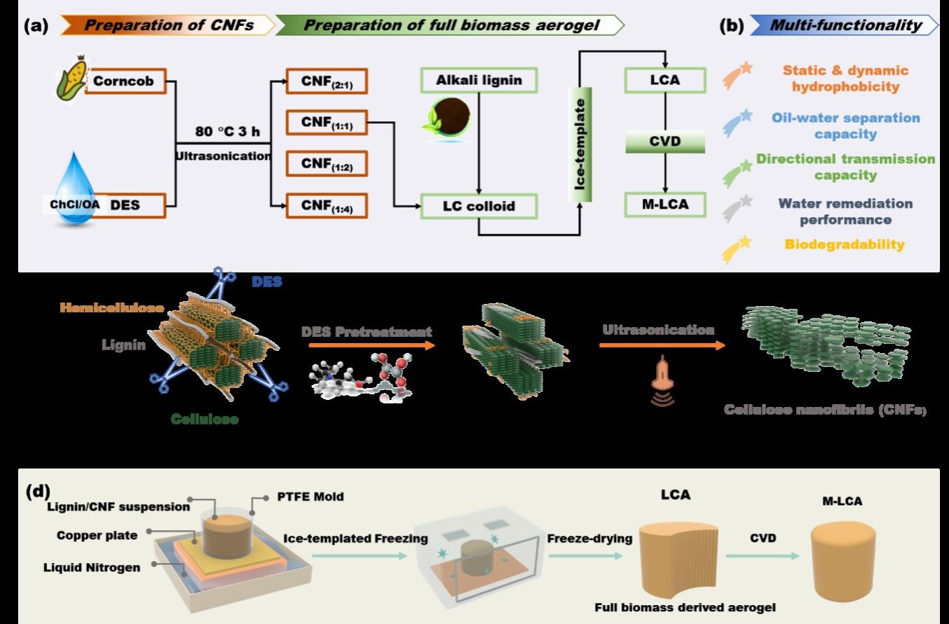 Figure 1 (a) Schematic of the experimental procedure for CNF isolation and fabrication of aerogels from full biomass, and (b) multi-functionality; (c) Schematic diagram of corncob fractionation using ChCl/OA-based DES and ultrasonication; (d) Schematic diagram of a hydrophobic full-biomass-derived aerogel prepared using a combination of the ice-templated freezing and CVD. 论文链接:https://doi.org/10.1016/j.cej.2023.146425