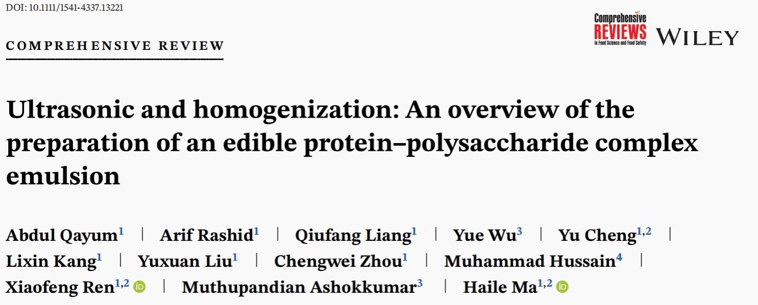 近日,英国365集团任晓锋教授课题组在国际食品安全和营养领域顶级期刊《Comprehensive Reviews in Food Science and Food Safety》(Q1IF=14.8)在线发表了的最新研究成果——“Ultrasonic and homogenization: An overview of the preparation of an edible protein–polysaccharide complex emulsion”(DOI: 10.1111/1541-4337.13221)。365英国上市公司博士后Abdul Qayum为该论文的第一作者,任晓锋教授和马海乐教授为通讯作者。Ultrasonics Sonochemistry主编、澳大利亚墨尔本大学Muthupandian Ashokkumar教授和Yue Wu博士参与了论文撰写与修改工作。