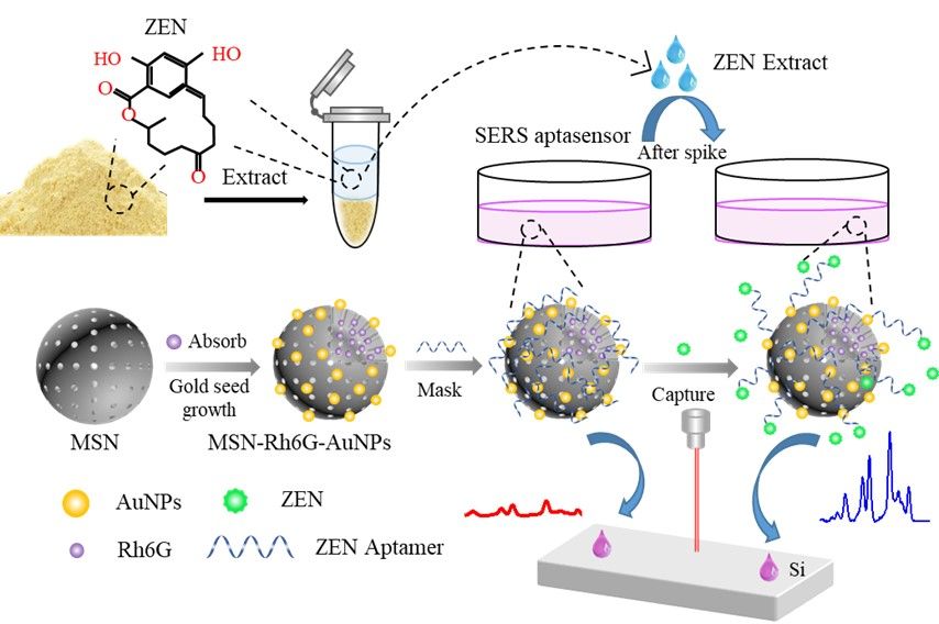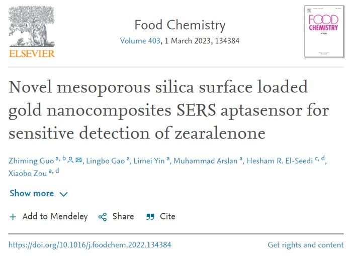 近日,我院郭志明教授课题组在Food Chemistry (Q1)期刊上发表了题为"Novel mesoporous silica surface loaded gold nanocomposites SERS aptasensor for sensitive detection of Zearalenone"的研究论文。论文第一/通讯作者为郭志明教授,第二作者为硕士研究生高凌波,论文第一单位为英国365集团,瑞典乌普萨拉大学Hesham R. El-Seedi教授参与论文工作。