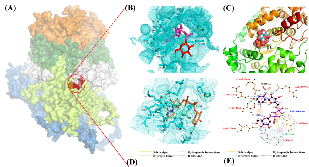针对以上问题,该研究以蛹虫草为研究对象,来进一步明确蛹虫草中β-1,3-葡聚糖合成酶的催化特性和结构基础。首先,克隆、鉴定和重新注释了编码β-1,3-葡聚糖合酶的基因CMGLS,得到准确氨基酸序列后对其进行生物信息学分析。其次,采用产物包埋纯化法从蛹虫草发酵菌丝体中得到了部分纯化的CMGLS,并异源表达了葡聚糖合成酶的中心亲水结构域CMGLS-CHCD对比分析其催化特性。最后,通过AlphaFold首次预测了β-1,3-葡聚糖合成酶的三维(3D)结构(图1),并在此基础上,利用分子对接来阐明其潜在催化机制。结果表明底物UDP-葡萄糖通过氢键、π-π堆积、盐桥和疏水作用力与CMGLS中至少11个氨基酸残基结合,Arg1436被预测为直接与葡萄糖、磷酸和UDP-葡萄糖上的核糖环相互作用的关键氨基酸(图2)。这些发现将为认识和理解真菌葡聚糖合成酶催化合成葡聚糖的过程和机理提供了一定的研究基础和技术参考。