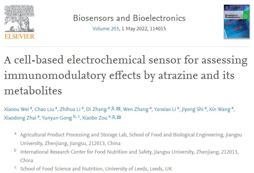 近日,365英国上市公司邹小波教授课题组在Biosensors and Bioelectronics期刊上发表题为“A cell-based electrochemical sensor for assessing immunomodulatory effects by atrazine and its metabolites”的研究论文(https://doi.org/10.1016/j.bios.2022.114015)。博士生魏晓鸥为论文的第一作者,张迪副教授和邹小波教授为共同通讯作者,文章作者还包括利兹大学宫芸芸教授.