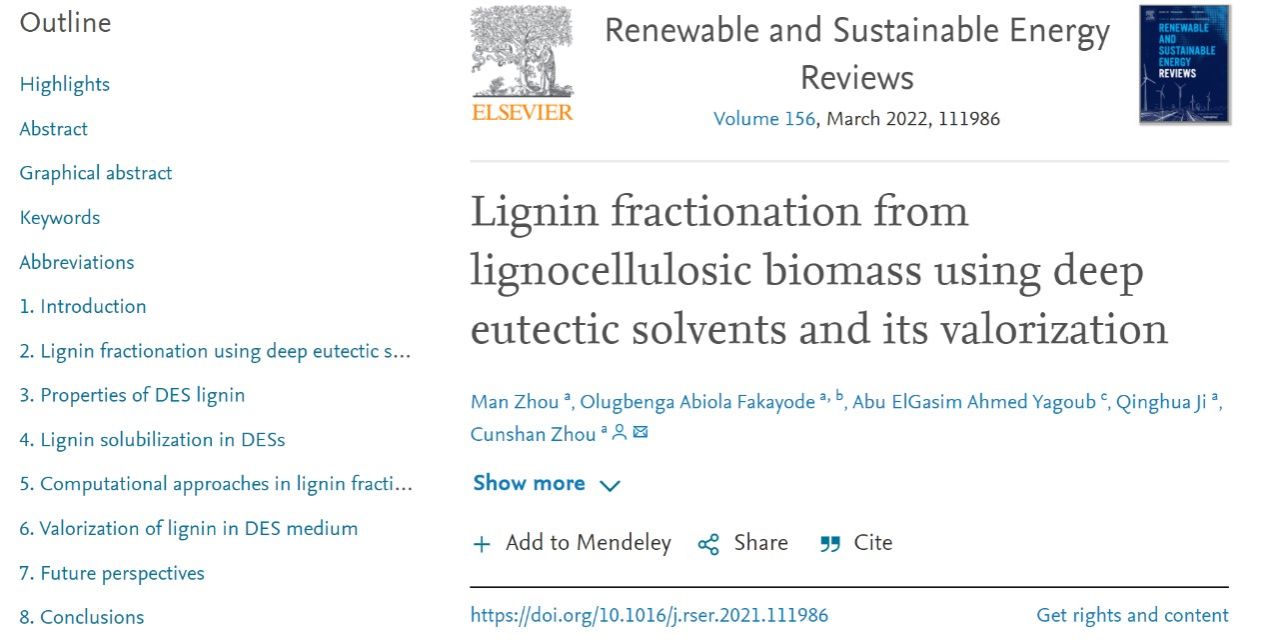 近日,我院周存山教授果蔬加工课题组标题为“Lignin fractionation from lignocellulosic biomass using deep eutectic solvents and its valorization”的综述文章在国际绿色可持续发展技术领域TOP期刊《Renewable and Sustainable Energy Reviews》在线发表(https://doi.org/10.1016/j.rser.2021.111986)。