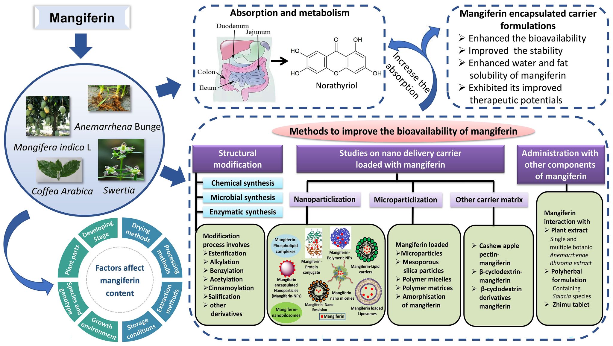 芒果苷广泛地分布在不同植物的根、茎、叶中,生长环境、发育阶段、收获季节、储藏方式等影响芒果苷的含量,了解其分布和影响因素对提高芒果苷的回收率提供了理论支持,并促进以芒果苷为主的营养或膳食补充剂的开发。芒果苷的吸收主要发生在小肠,通过被动扩散的方式进行,在胃肠道的不同区段的吸收能力不同。此外,还需要更多的研究来评估芒果苷的吸收代谢,其代谢物可能会影响芒果苷的生物活性。芒果苷的纳米颗粒、微粒化、成盐作用、与天然/合成化合物的络合以及与其他成分的联合给药,是提高芒果苷生物活性及其生物利用度的主要方法,并且大部分研究已申请专利。但是在开发出高可溶性和高生物利用度的天然健康产品或食品补充剂方面仍存在一些限制,例如成本高,产量低等。目前,芒果苷尚未作为一种广泛使用的临床药物,并且关于芒果苷临床疗效的文献有限,因此芒果苷的药代动力学和安全性评估需要进一步研究。