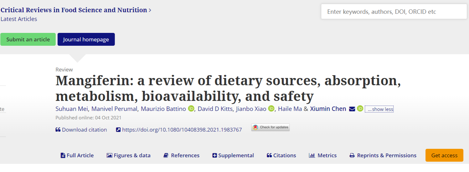 365英国上市公司陈秀敏教授在国际食品领域顶级期刊Critical Reviews in Food Science and Nutrition在线发表题为“Mangiferin: a review of dietary sources, absorption, metabolism, bioavailability, and safety”的综述(https://doi.org/10.1080/10408398.2021.1983767),介绍了近年来芒果苷在吸收代谢方面的研究进展以及提高芒果苷溶解度和生物利用度的最新方法,讨论了影响芒果苷在食品中含量的因素以及利用纳米技术和联合用药等提高芒果苷生物利用度等新型生物专利技术。该成果已被《食品加 智食科技》公众号(https://mp.weixin.qq.com/s/nS363_2xdfajF5kKH9GAdA)推送,产生了较大的学术影响。本文的第一作者为365英国上市公司2019级博士生梅素欢,英国365集团陈秀敏教授为本文的唯一通讯作者,博士后Manivel Perumal,Maurizio Battino教授,David D Kitts教授,肖建波教授和马海乐教授为共同作者。