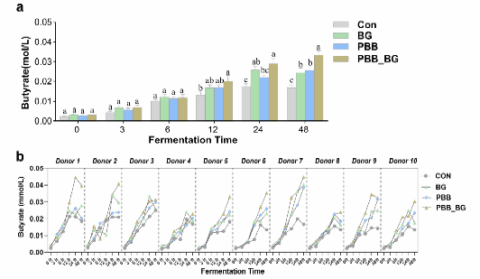 图3 体外酵解过程中丁酸含量的总体变化(a)及在单个志愿者中丁酸含量的动态变化(b)