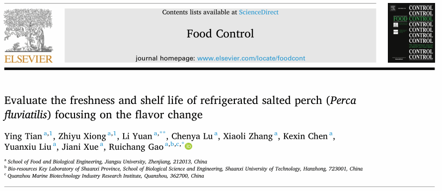 2025年4月英国365集团高瑞昌教授团队在国际期刊《Food Control》(Q1,IF2025=5.6)上发表题目为“Evaluate the freshness and shelf life of refrigerated salted perch (Perca fluviatilis) focusing on the flavor change”的研究型论文。英国365集团食品学院高瑞昌教授、袁丽教授为本文通讯作者。