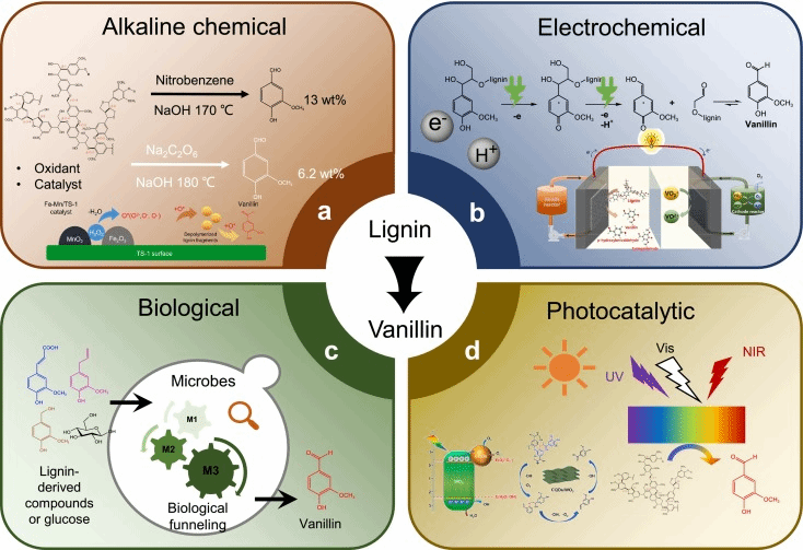 香兰素(4-羟基-3-甲氧基苯甲醛)是一种全球需求量大、应用广泛的香料。目前,约有15%的香兰素市场份额是通过以木质素为原料的氧化裂解方式获得的。近年来,离子液体(ILs)和低共熔溶剂(DESs)作为新型绿色溶剂,它们具有分子设计灵活、热稳定性高、可循环利用等优势,并能同时作为溶剂和催化剂,在木质素的催化转化中展现出巨大潜力。借助ILs和DESs的独特性质,木质素的催化裂解过程不仅更高效,而且对环境的影响也更小。
