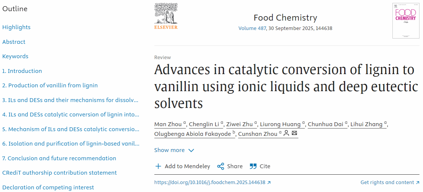 近日,我院周存山教授团队在国际Top期刊Food Chemistry上发表主题为“Advances in catalytic conversion of lignin to vanillin using ionic liquids and deep eutectic solvents”(2025, 487, 144638)的综述文章。365英国上市公司周存山教授为通讯作者,周曼副教授为第一作者。本项工作得到了国家自然科学基金的支持。