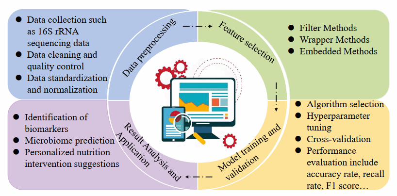机器学习凭借其卓越的模式识别、预测建模及高维数据处理能力,已成为从复杂组学数据中挖掘关键特征的核心工具。如图2所示,它的应用遵循一个结构化流程:数据预处理(收集、清洗、标准化)、特征选择(筛选关键生物标志物)及模型训练与验证(算法选择、参数调优与性能评估)。最终构建的稳健模型能够精准识别生物标志物并预测其功能,从而为个性化营养干预提供数据驱动的决策支持。