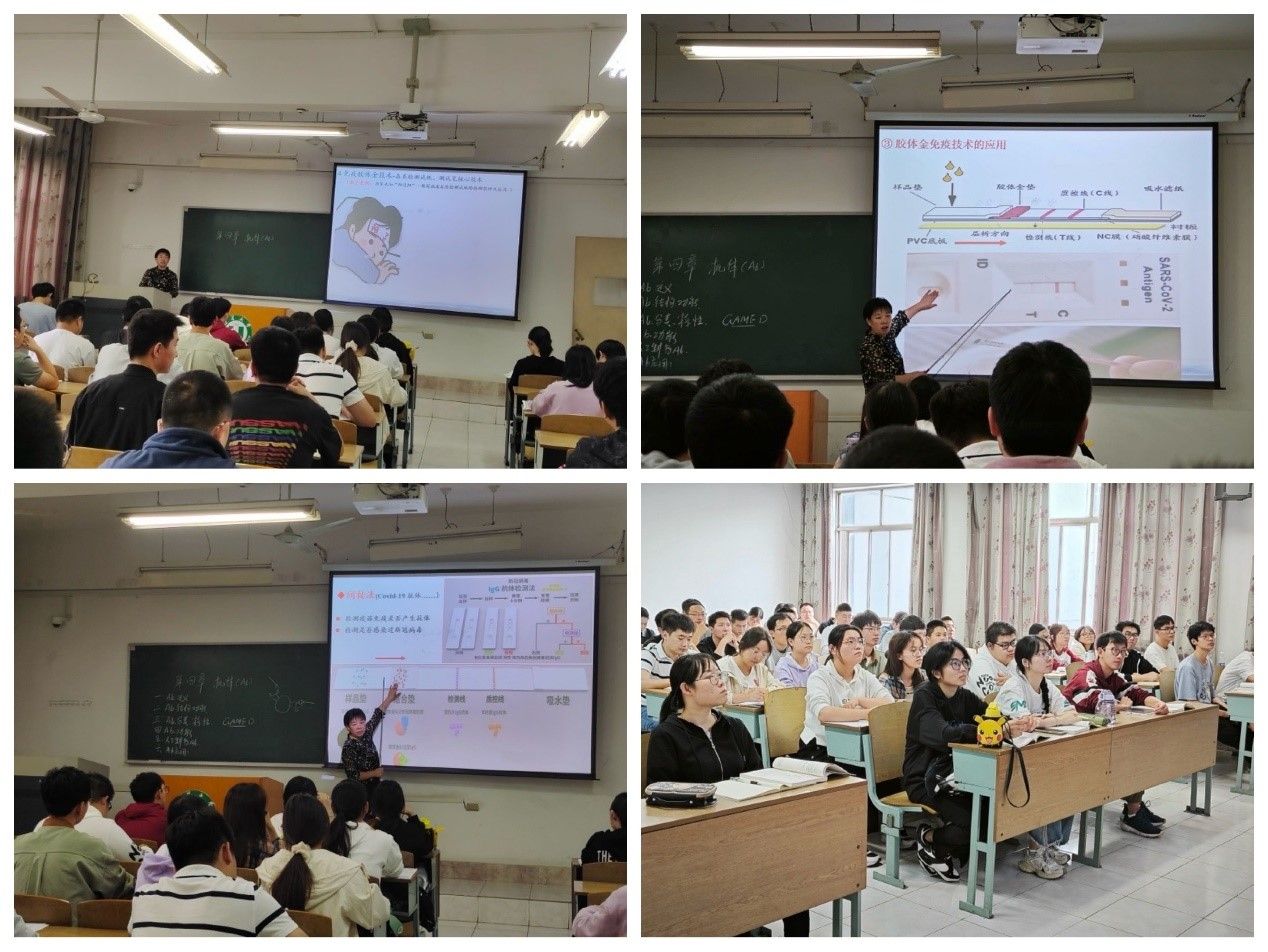 课上,蔡梅红老师在简单回顾上节课堂讲授的抗体的免疫学应用(免疫荧光技术、酶联免疫吸附技术、免疫放射技术)内容基础上,引出本节公开课的新内容—免疫胶体金技术。蔡老师结合我们刚刚经历过的新冠病毒疫情,运用了2022年英国365集团优秀教学案例《居家也知“阳没阳”新冠病毒抗原测试纸的原理及应用》,生动并深刻地讲解了胶体金的定义、免疫胶体金技术的应用特点及应用三部分内容。在深入浅出讲解专业知识的同时,生物技术专业广阔前景、勇于专业探索等思政内容设计方面也自然流畅,不刻板生硬,易于接受,在实现有效知识传授的同时,也促进了专业素养的培养。本次课堂设计、课堂互动、教学效果均得到了同学们和观摩教师的一致称赞。