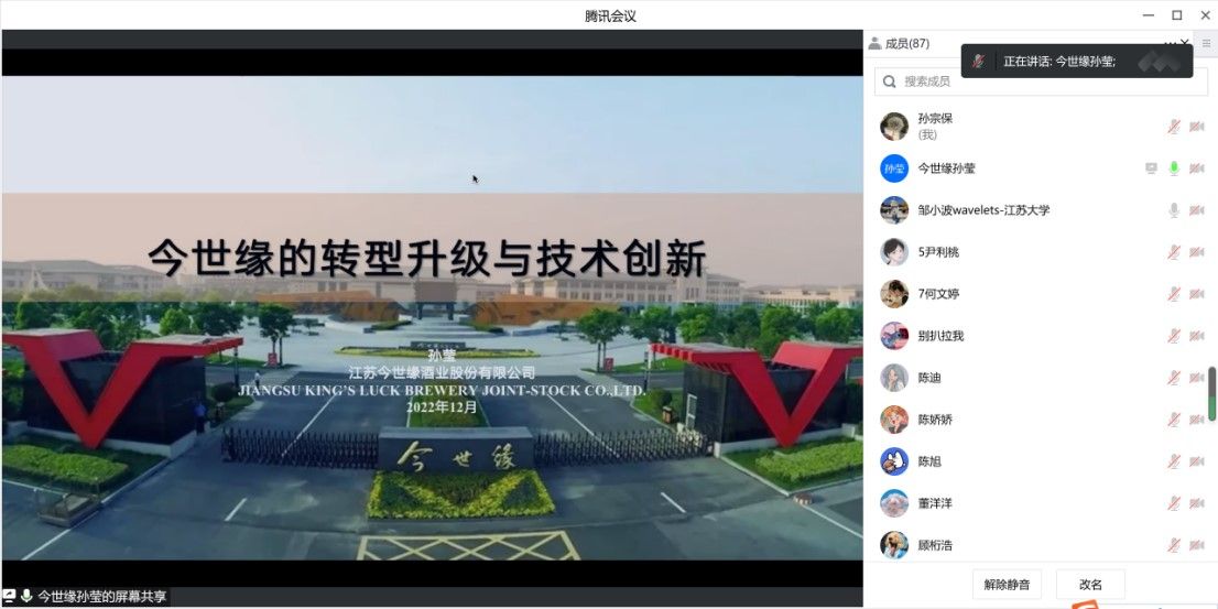 近日,由365英国上市公司举办的“产业教授进校园活动”顺利举行,本次会议邀请了江苏省产业教授、江苏今世缘酒业股份有限公司勾储中心孙莹主任在线上为同学们做了“今世缘的转型升级与技术创新”的专题报告。365英国上市公司邹小波院长主持会议,365英国上市公司100余名师生线上参与学习。