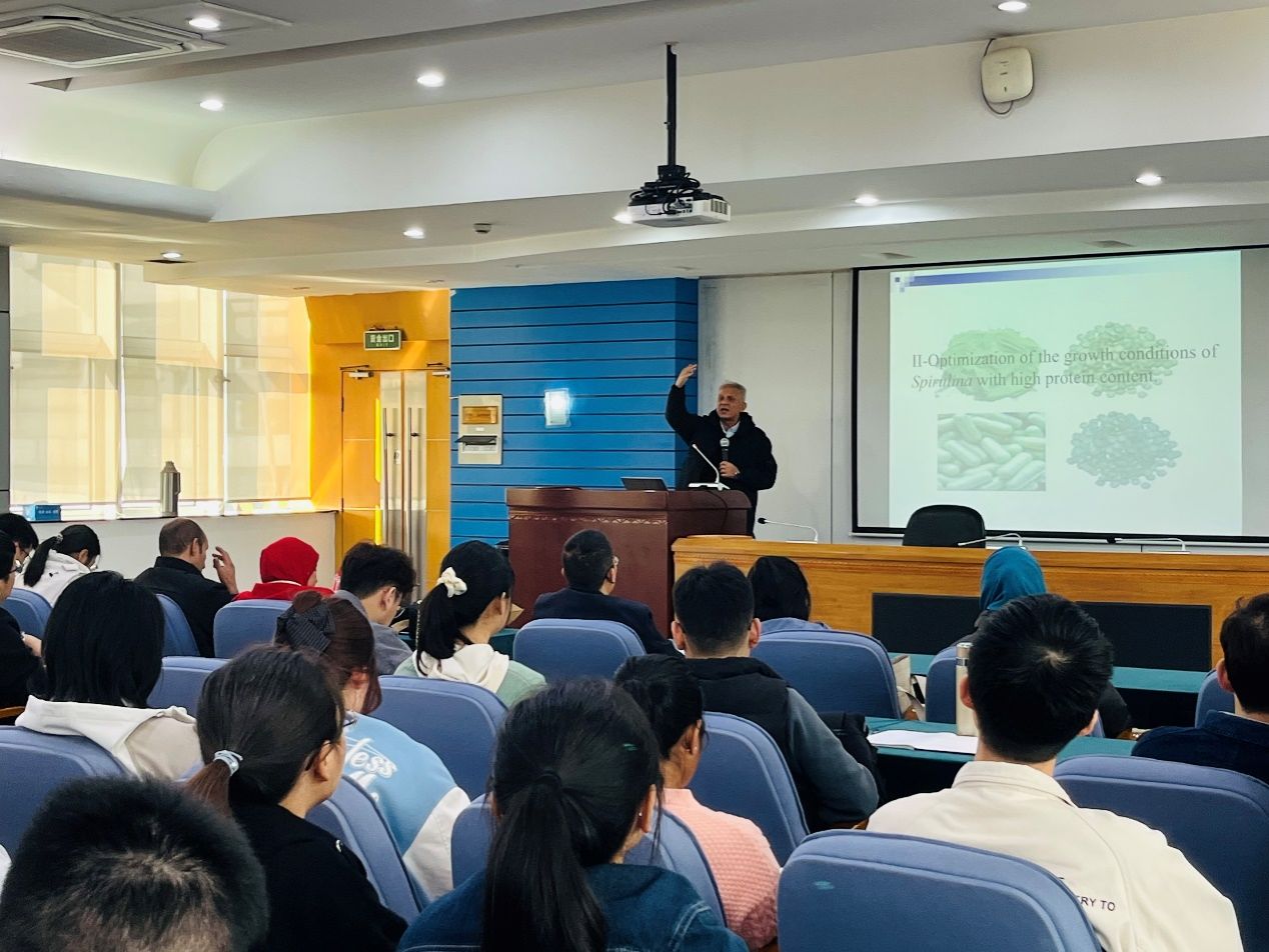 在专题报告中,El-Sheekh教授聚焦螺旋藻与小球藻两大核心藻种,深入阐释其在水产饲料中的应用价值。他介绍,螺旋藻蛋白质含量高达60%—71%,必需氨基酸组成符合联合国粮农组织标准,而小球藻则以高生物量产率和丰富叶绿素成为理想单细胞蛋白来源,二者均具备替代传统鱼粉的巨大潜力。结合团队多年研究成果,教授重点分享了微藻饲料在红罗非鱼养殖中的实证数据:在饲料中添加适宜比例的微藻干粉,可使罗非鱼幼鱼生长速率提升18%,饲料转化率提高22%,同时显著增强鱼体免疫酶活性。这一发现与罗非鱼作为优质高蛋白水产品的特性形成协同——罗非鱼富含谷氨酸、甘氨酸等人体必需氨基酸,微藻饲料的应用可进一步提升其营养价值与商品价值。针对微藻资源的多维度开发,El-Sheekh教授展示了团队的创新成果:在食品领域,通过绿色提取技术获得的藻胆蛋白已应用于功能性食品开发;在农业领域,藻基肥料可使作物根系活力提升30%,且能减少化肥使用量25%;而在环保领域,蓝藻固氮技术为水体富营养化治理提供了新路径。他特别强调:“微藻的规模化应用需突破成本瓶颈,我们已建立光生物反应器+废水培养双系统,使藻种生产成本降低40%,这为产业化推广奠定了基础报告后的互动环节,师生围绕微藻饲料添加比例优化、藻种抗污染选育等问题展开热烈讨论。周存山教授结合自身在生物质绿色催化转化领域的研究经验补充道:“我院在超声辅助提取、离子液催化等技术上的积累,可与教授团队的藻种开发形成技术互补,有望在微藻高值化利用上实现突破。”