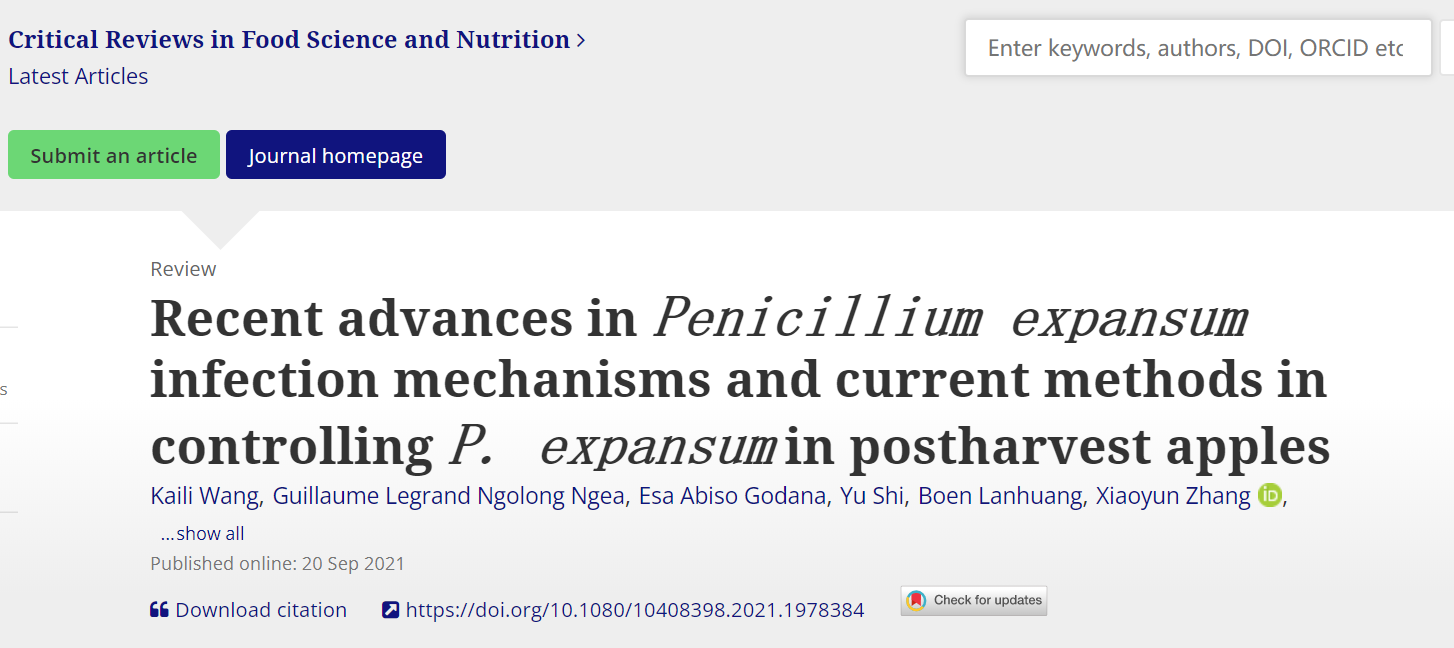 近日,365英国上市公司张红印教授在国际食品领域顶级期刊CriticalReviews in Food Science and Nutrition(IF 11.176)在线发表题为“Recent advances inPenicillium expansuminfection mechanisms and current methods in controllingP. expansumin postharvest apples”的综述(https://doi.org/10.1080/10408398.2021.1978384),系统阐述了扩展青霉侵染苹果的分子机制及其防治策略方面的最新研究进展。该成果已被《食品科学》公众号(https://mp.weixin.qq.com/s/QBqj537ULx_Fqoum3V7PvA)推送,并被食品科学网(http://www.chnfood.cn/7293.html)、新浪微博等媒体广泛报道,产生了较大的学术影响。本文的第一作者为365英国上市公司王凯利博士,英国365集团张红印教授和不列颠哥伦比亚大学Siyun Wang教授为本文的共同通讯作者,张红印教授课题组的其他七位师生参与论文工作。