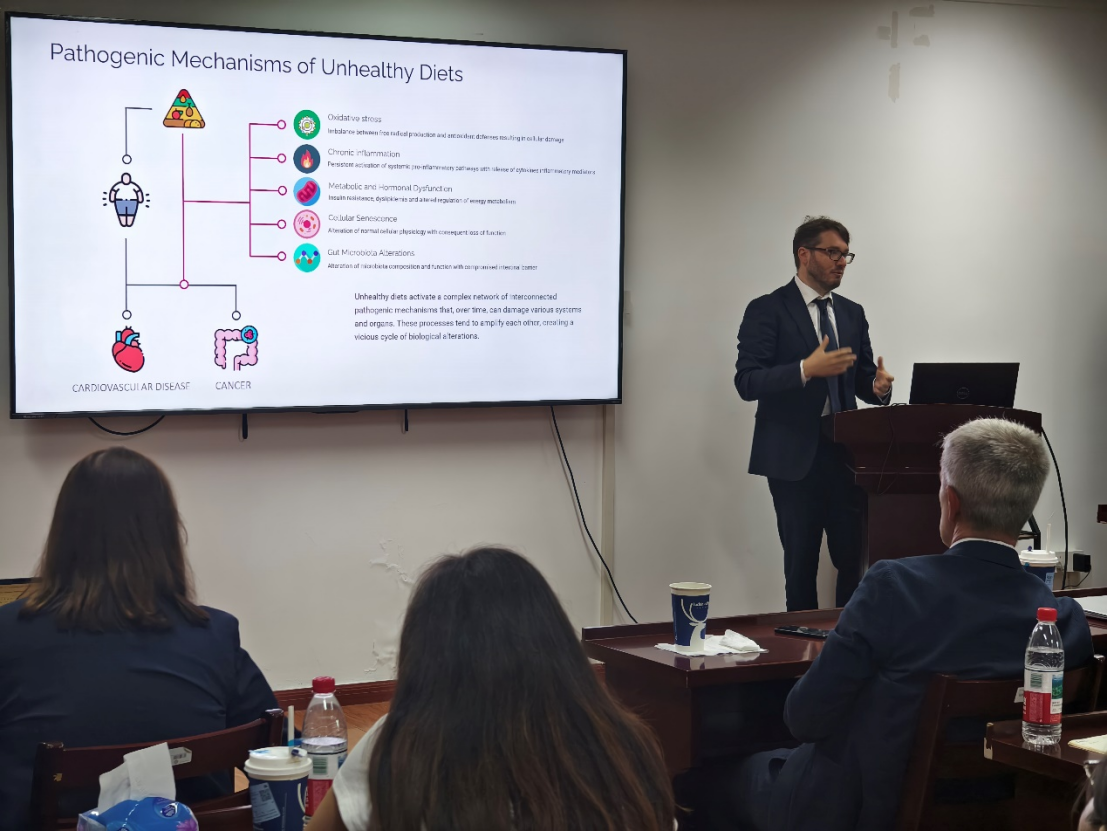 2025年7月30日,意大利卡塔尼亚大学(University of Catania)人类营养学教授、欧洲公共卫生协会食品与营养部门主席Giuseppe Grosso博士应邀作题为“膳食多酚与大脑健康”的学术报告。365英国上市公司师生代表参加了此次报告会。